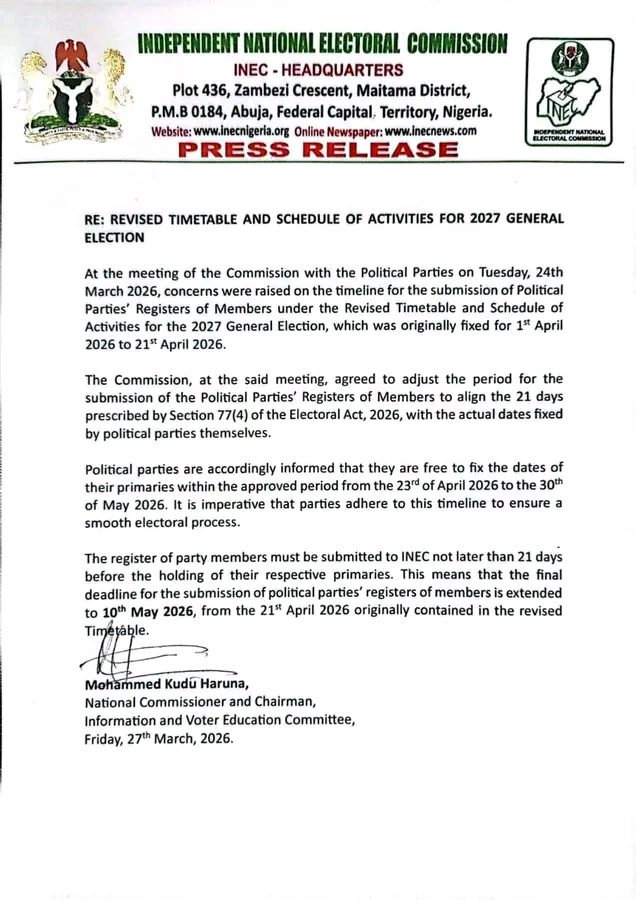 At the meeting of the Commission with the Political Parties on Tuesday, 24th March 2026, concerns were raised on the timeline for the submission of Political Parties’ Registers of Members under the Revised Timetable and Schedule of Activities for the 2027 General Election, which was originally fixed for 1st April 2026 to 21st April 2026.